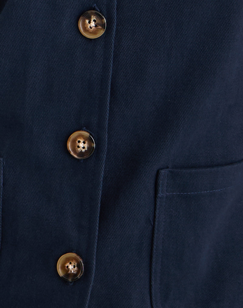The Calva jacket, in dark navy, features a boxy fit, tan buttons, two pockets at the front, and a collared neckline.