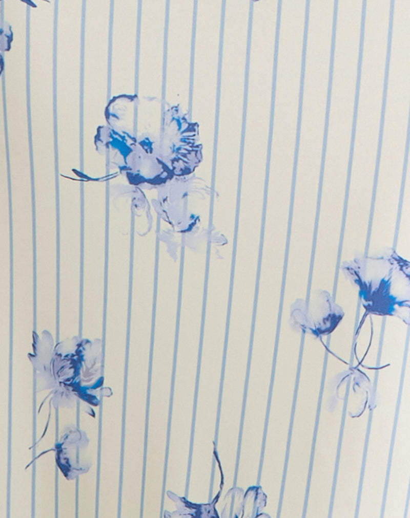 The Fadwa midi dress in floral stripe cream features a halter neckline, with a loose fit, jersey fabric and repeat blue floral pattern.