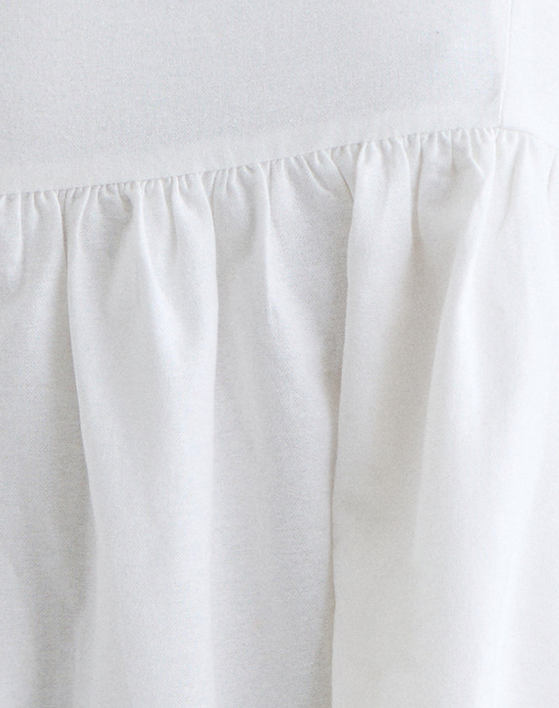 The Kayla mini dress in a linen ivory fabric. Featuring a smock design with a square neckline and tie straps.