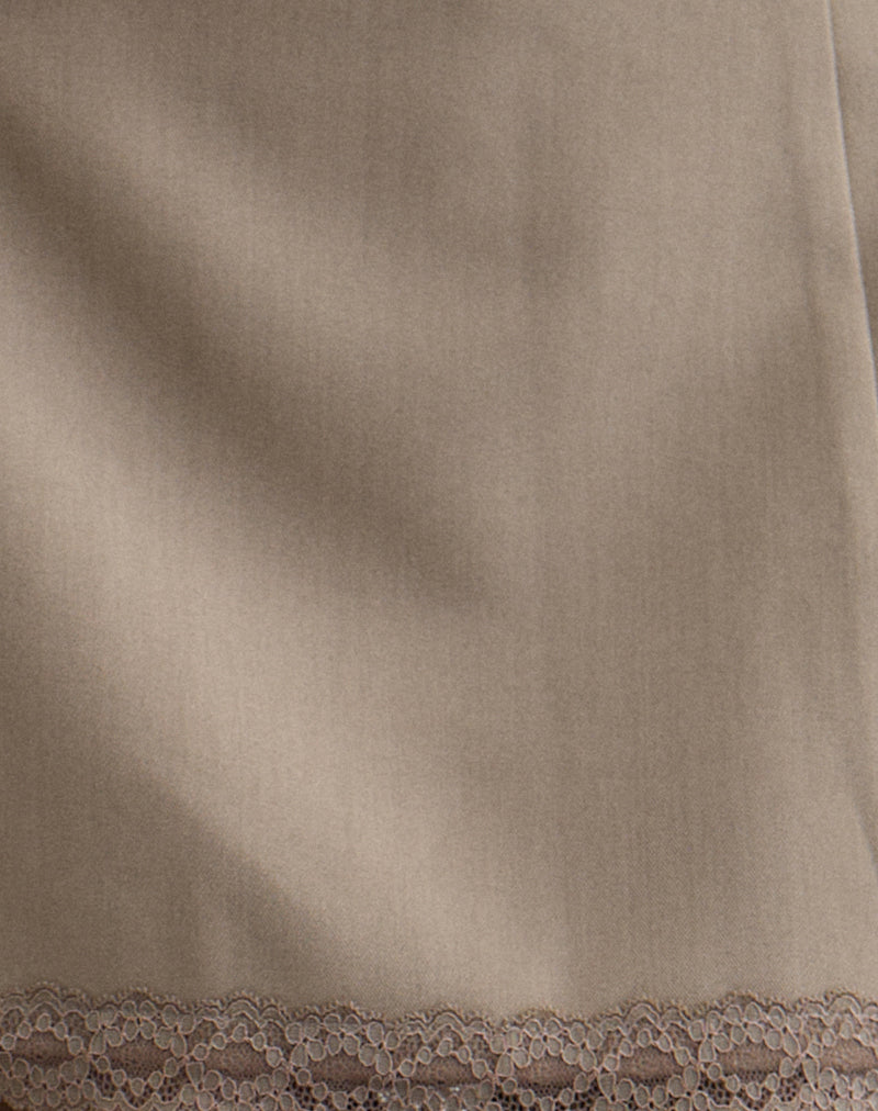 The Minya skirt is a low-waisted mini cut from taupe textured tailoring. It features a tonal lace trim along the hemline.